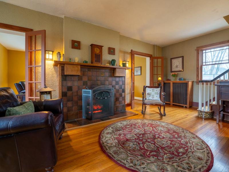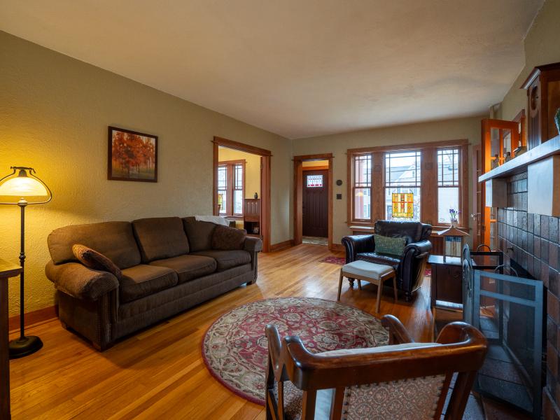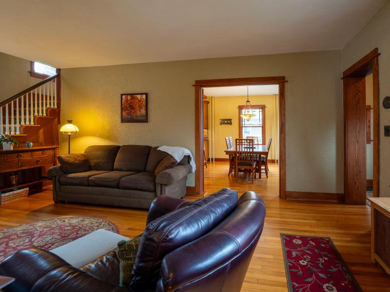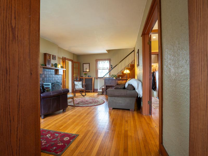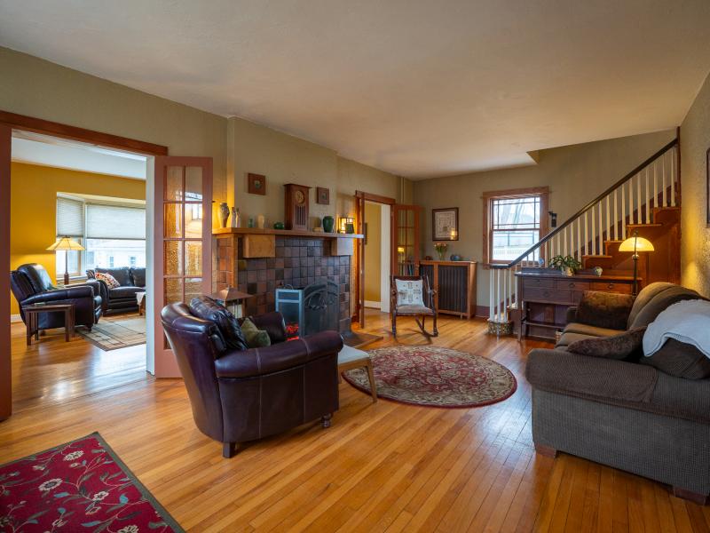 Entering the front foyer, it’s immediately clear this is a one-of-a-kind home. Nine-foot ceilings and abundant windows create a bright, open feel, while French glass-paned doors provide separation when needed and easy flow throughout the first floor. The renovated kitchen connects seamlessly to the dining room, making meal prep both enjoyable and social. Whether gathered around the living room fireplace or settling in for movie night in the family room, there are plenty of options for relaxing.